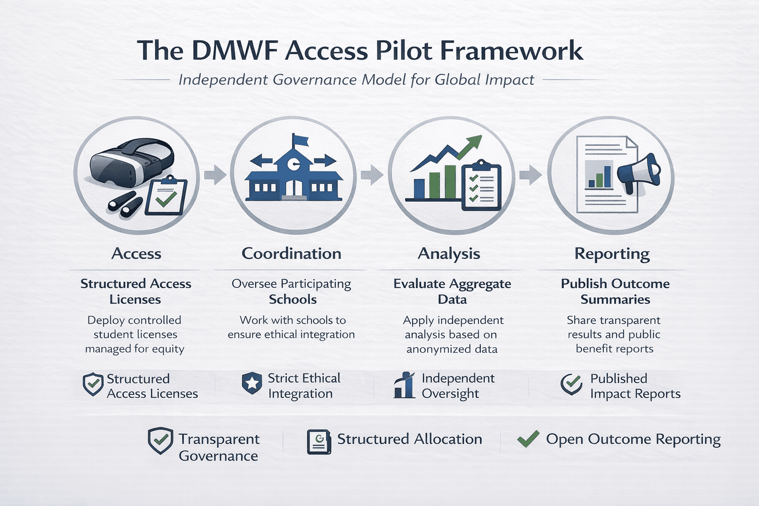 DMWF coordinates licensed student access, university implementation, and independent observation of pilot outcomes.